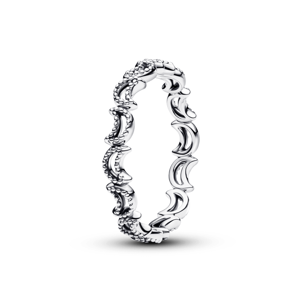 O Anel de Prata Pequena Lua Brilhante da Pandora simboliza a unidade cósmica, os ciclos de renovação e o poder do tempo. Com acabamento manual em prata de lei, seu design apresenta uma sequência delicada de luas crescentes interligadas, adornadas por pequenas esferas que adicionam textura e luminosidade à peça. Uma joia que reflete harmonia e transformação, perfeita para ser usada sozinha ou combinada com outros anéis da coleção Pandora Moments. Elegante e atemporal, é o acessório ideal para quem busca beleza e significado em cada detalhe.