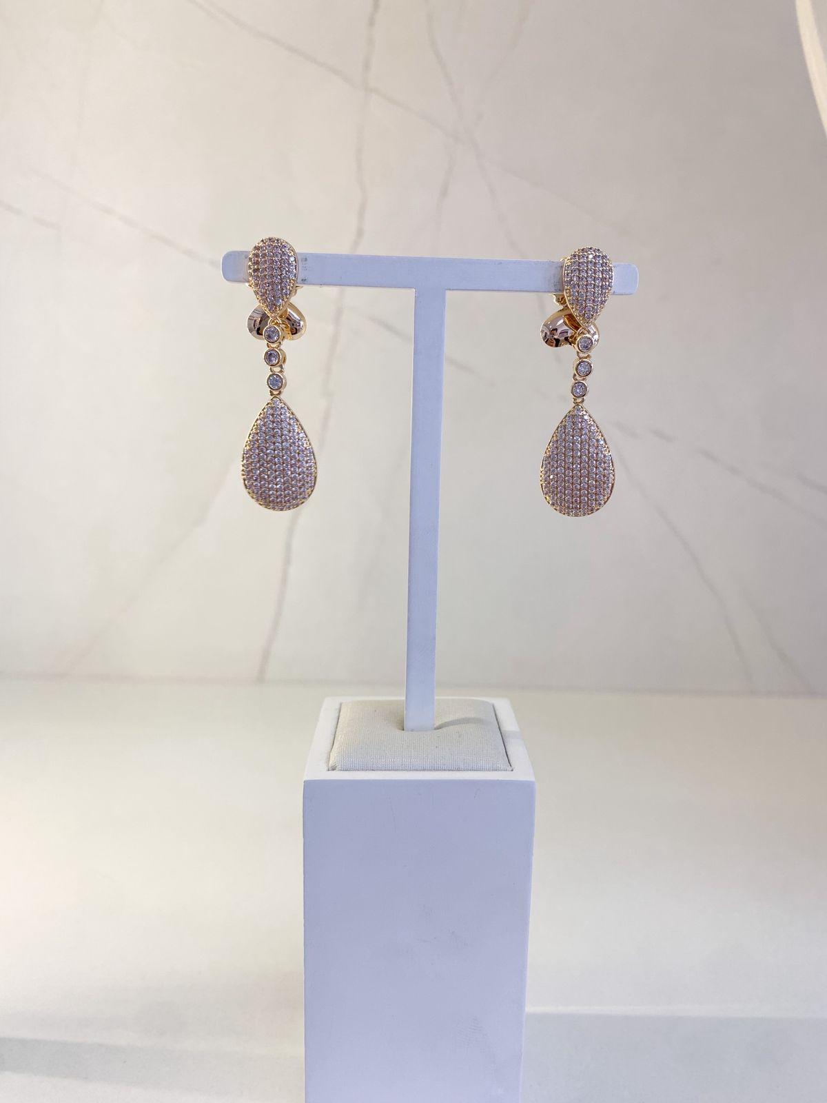 Brinco Adry possui zircônias cravejadas douradas. Com fechamento em tarraxas borboletas, banho de ouro 18k e antialérgica. É uma opção confortável, podendo ser usada sozinha ou em composição com outros brincos Lulu.