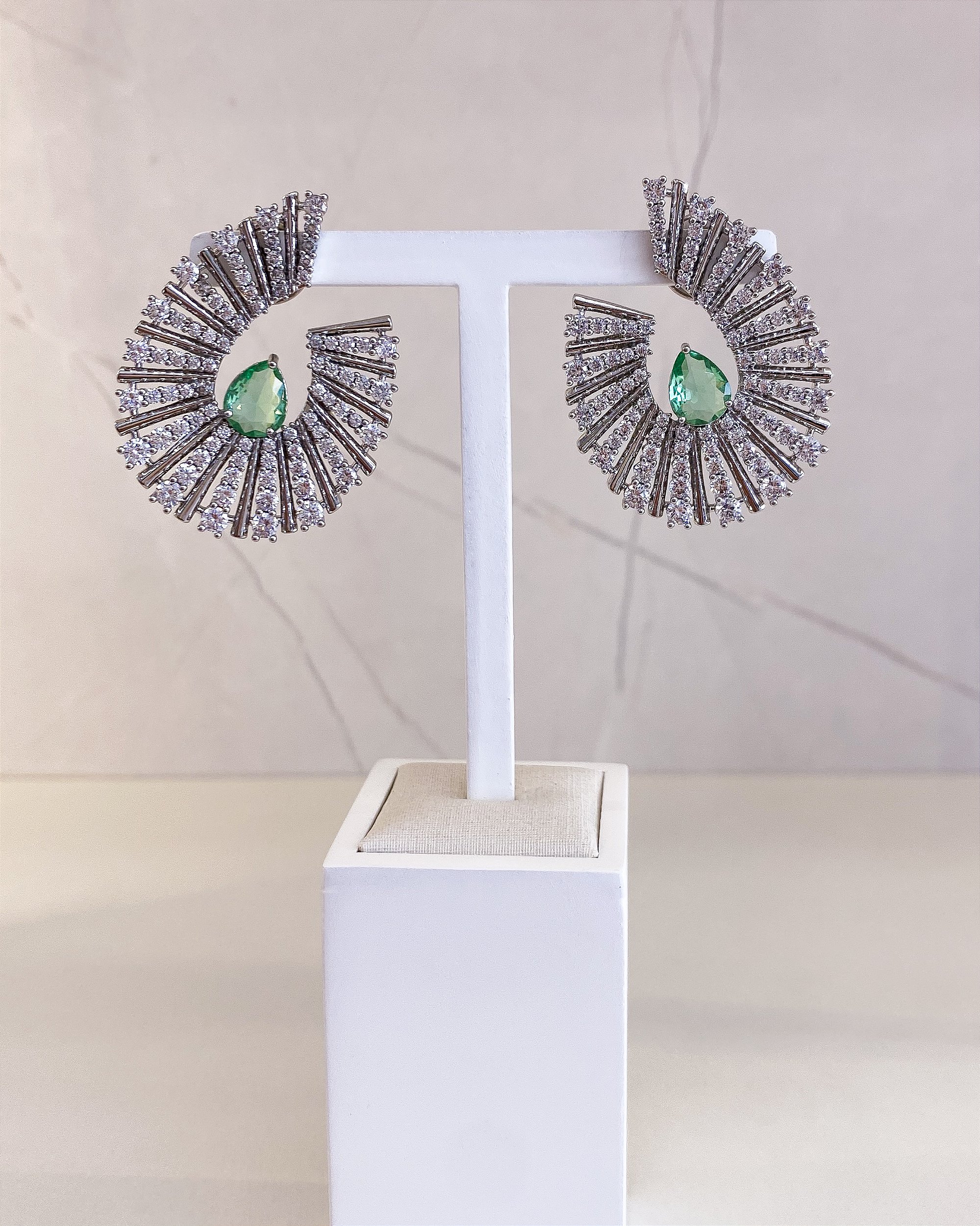 O Brinco Celine possui banho prata, zircônias cravejadas no cristal e verde, dando ponto de cor em sua estrutura.