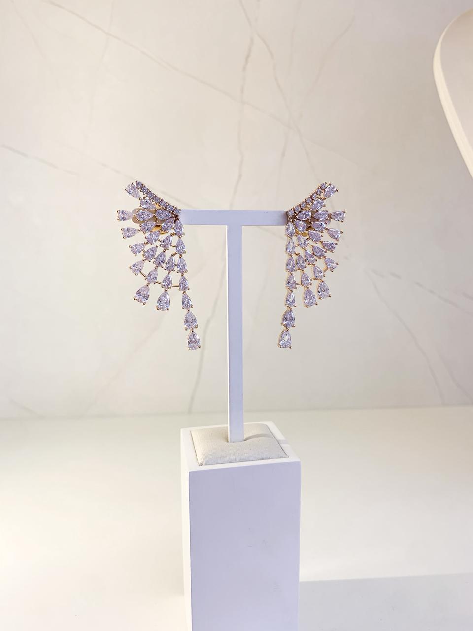 Brinco Leti possui zircônias cravejadas douradas. Com fechamento em tarraxas redondas, banho de ouro 18k e antialérgica. É uma opção confortável, podendo ser usada sozinha ou em composição com outros brincos Lulu.