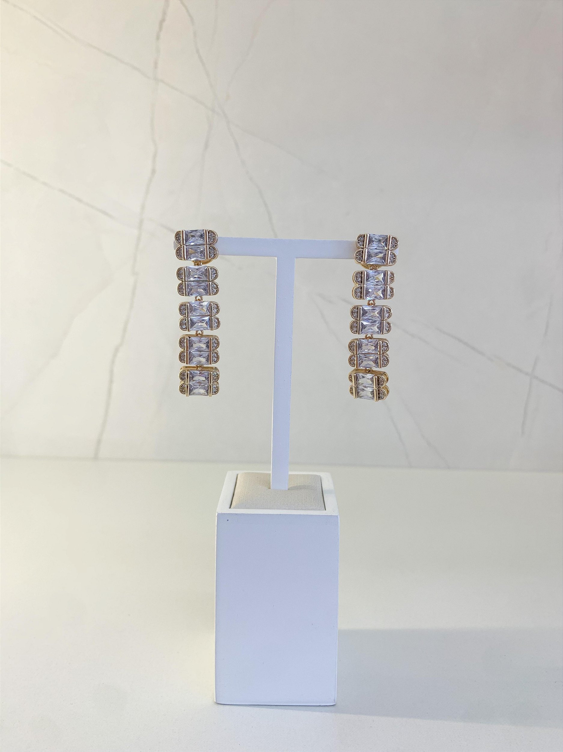 Brinco Maria Fernanda possui zircônias cravejadas douradas. Com fechamento em tarraxas redondas, banho de ouro 18k e antialérgico. É uma opção confortável, podendo ser usada sozinha ou em composição com outros brincos Lulu.