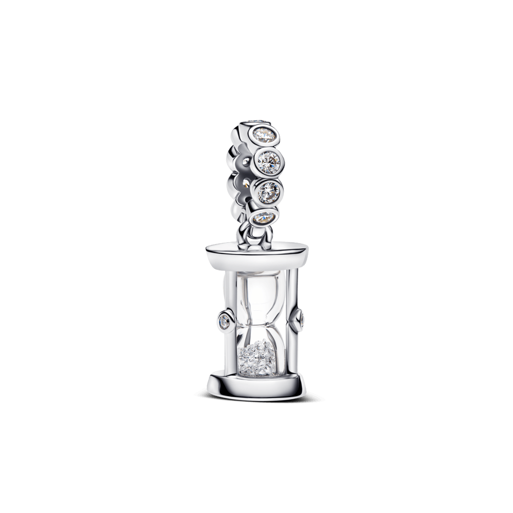 O Charm Pendente Ampulheta Brilhante Pandora é uma homenagem poética ao tempo e aos instantes que moldam nossas histórias. Feito em prata de lei, apresenta uma estrutura delicada em forma de ampulheta com pedras de zircônia cúbica transparentes que se movem suavemente dentro do vidro, criando um efeito encantador. O aro é decorado com mais cristais, reforçando o brilho e a elegância da peça. Este charm Pandora Moments simboliza a passagem do tempo e o valor de cada segundo vivido — uma joia que inspira a apreciar o presente com brilho e propósito.