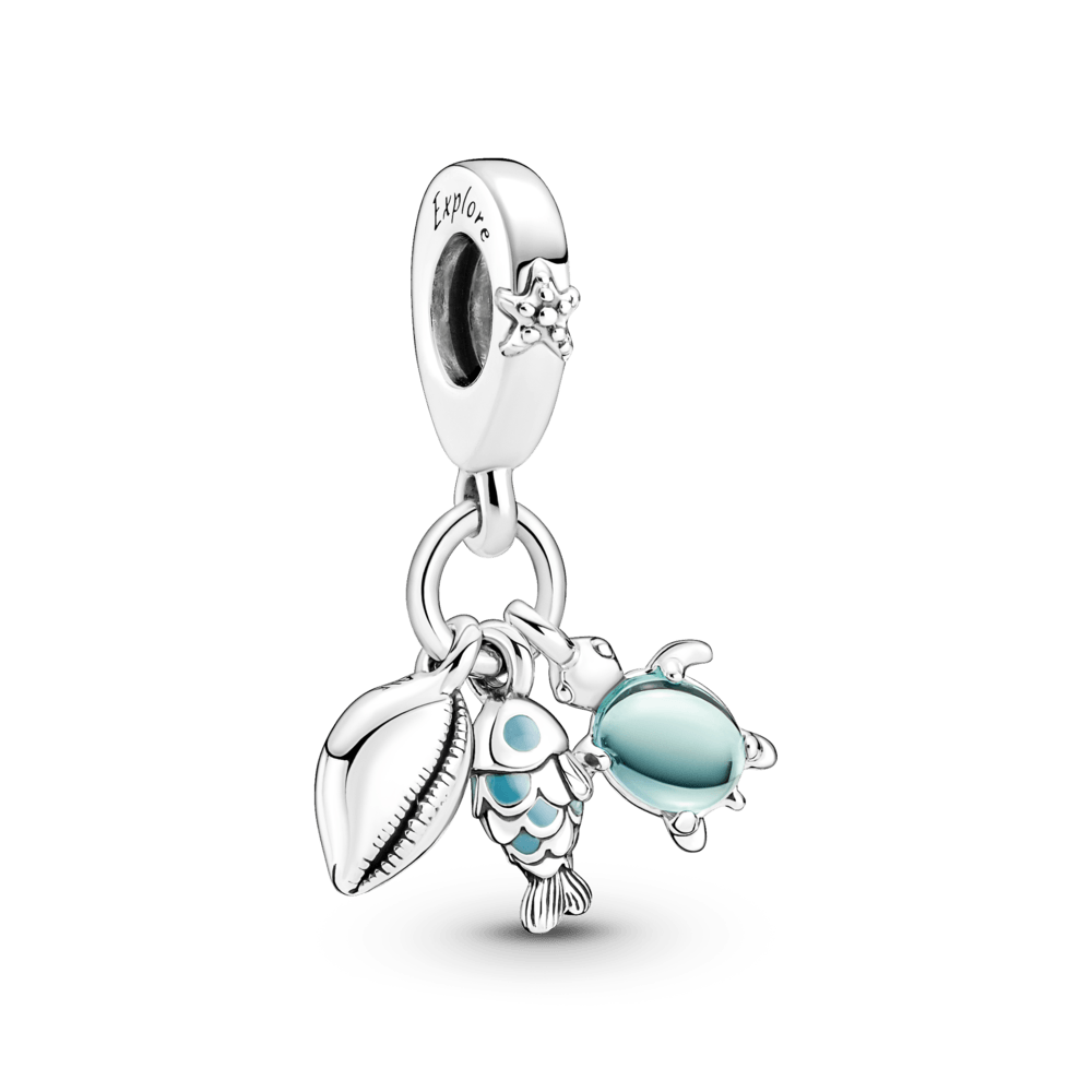 Embarque em uma aventura no fundo do mar e conheça as lindas criaturas do onírico mar azul-profundo com este charm pendente triplo de tema marítimo. Este trio de charms pendentes em prata de lei inclui uma concha, um peixe com escamas com detalhes em esmalte azul-turquesa e uma tartaruga marinha com vidro Murano azul e verde em dois tons como sua carcaça. A alça ostenta uma pequenina estrela-do-mar elevada e as mensagens Explore (Explore) e Dream (Sonhe), lembrando você de buscar sua próxima aventura, onde quer que ela seja.
