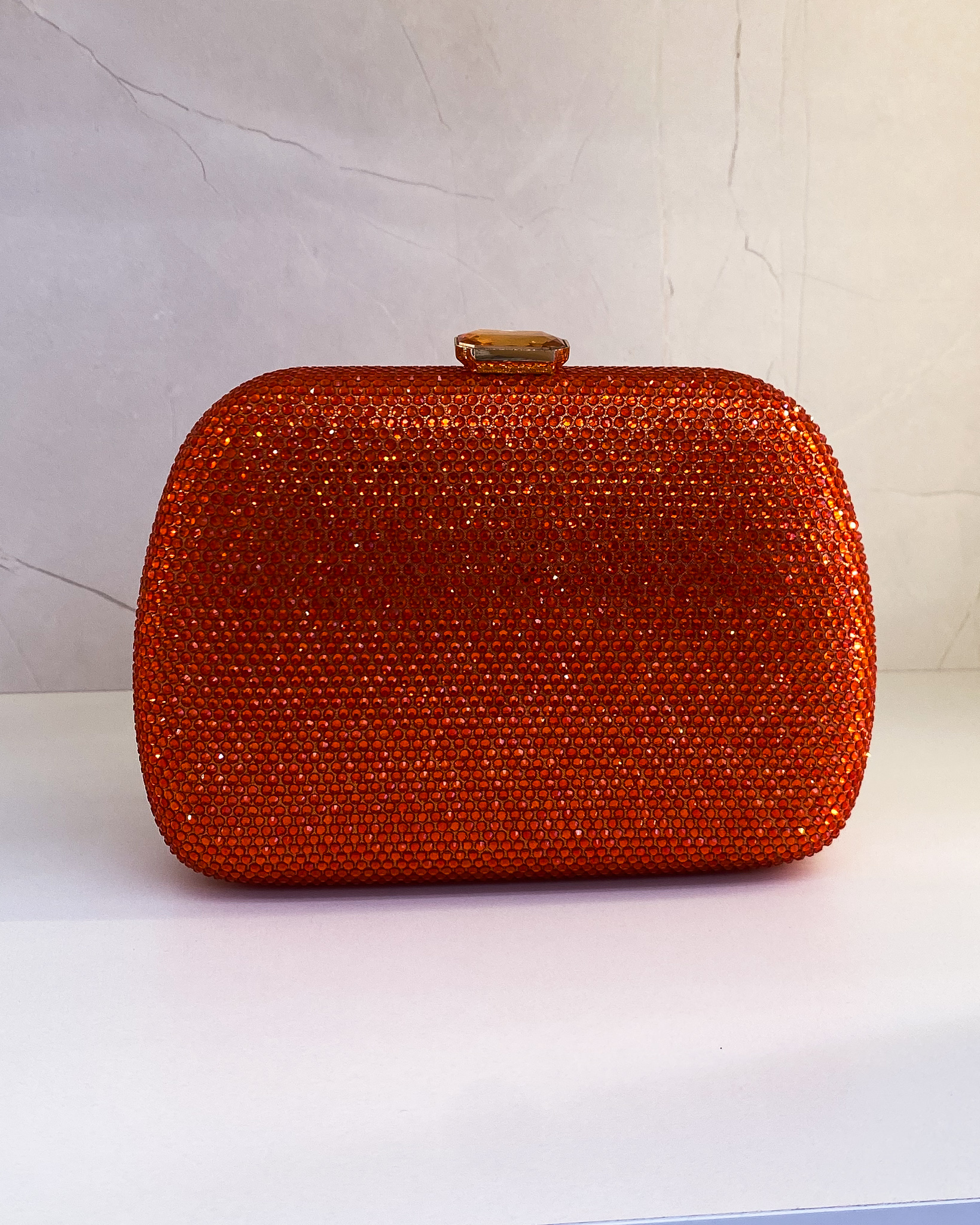 Bolsa Clutch Laranja com forro interno e alça removível, medindo aproximadamente 18 cm de comprimento, 14cm de altura e 4 cm de largura.