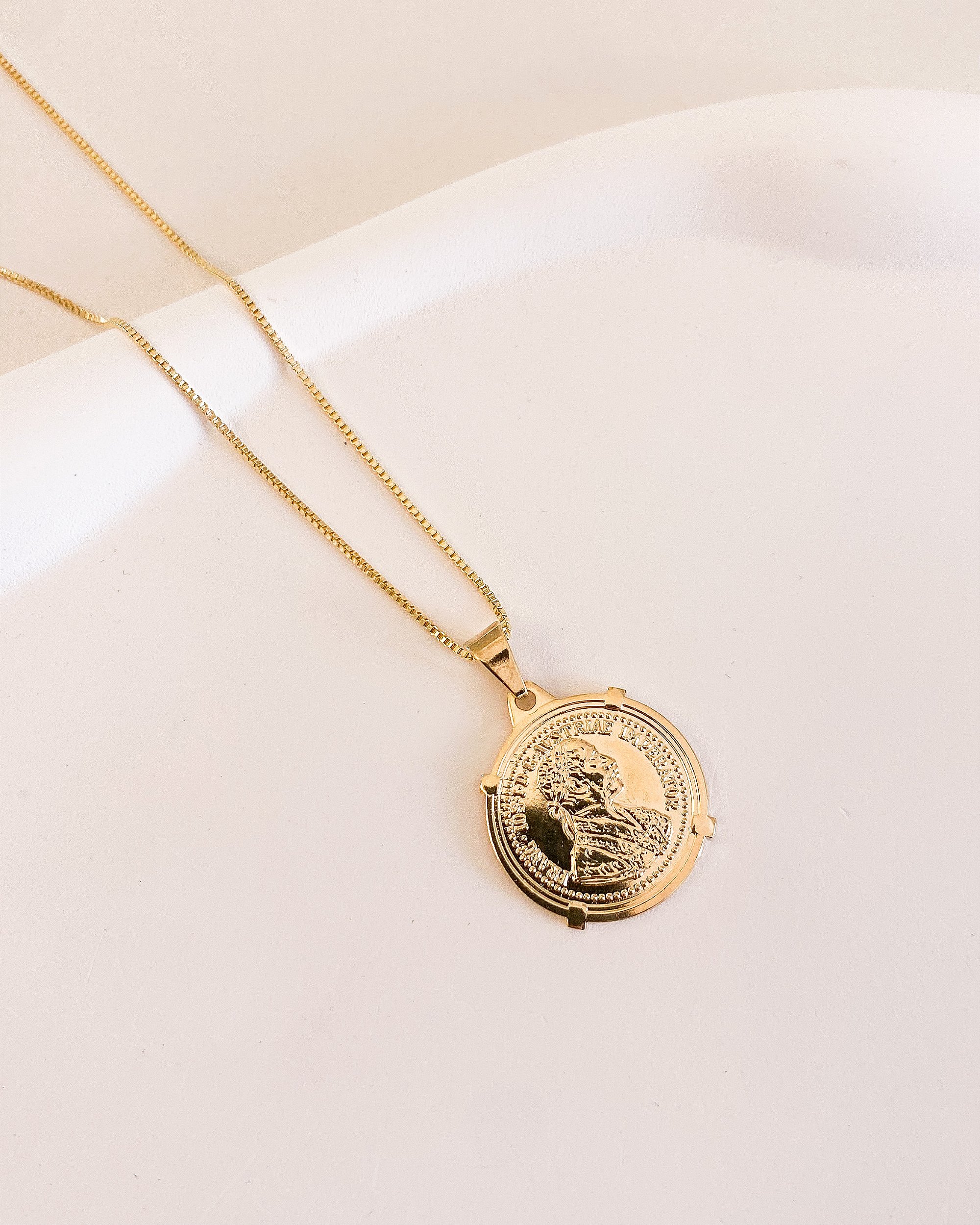Este colar exala elegância clássica e estilo sofisticado. Apresentando uma delicada corrente veneziana, este acessório é complementado por um deslumbrante pingente de moeda, habilmente banhado a ouro 18k.