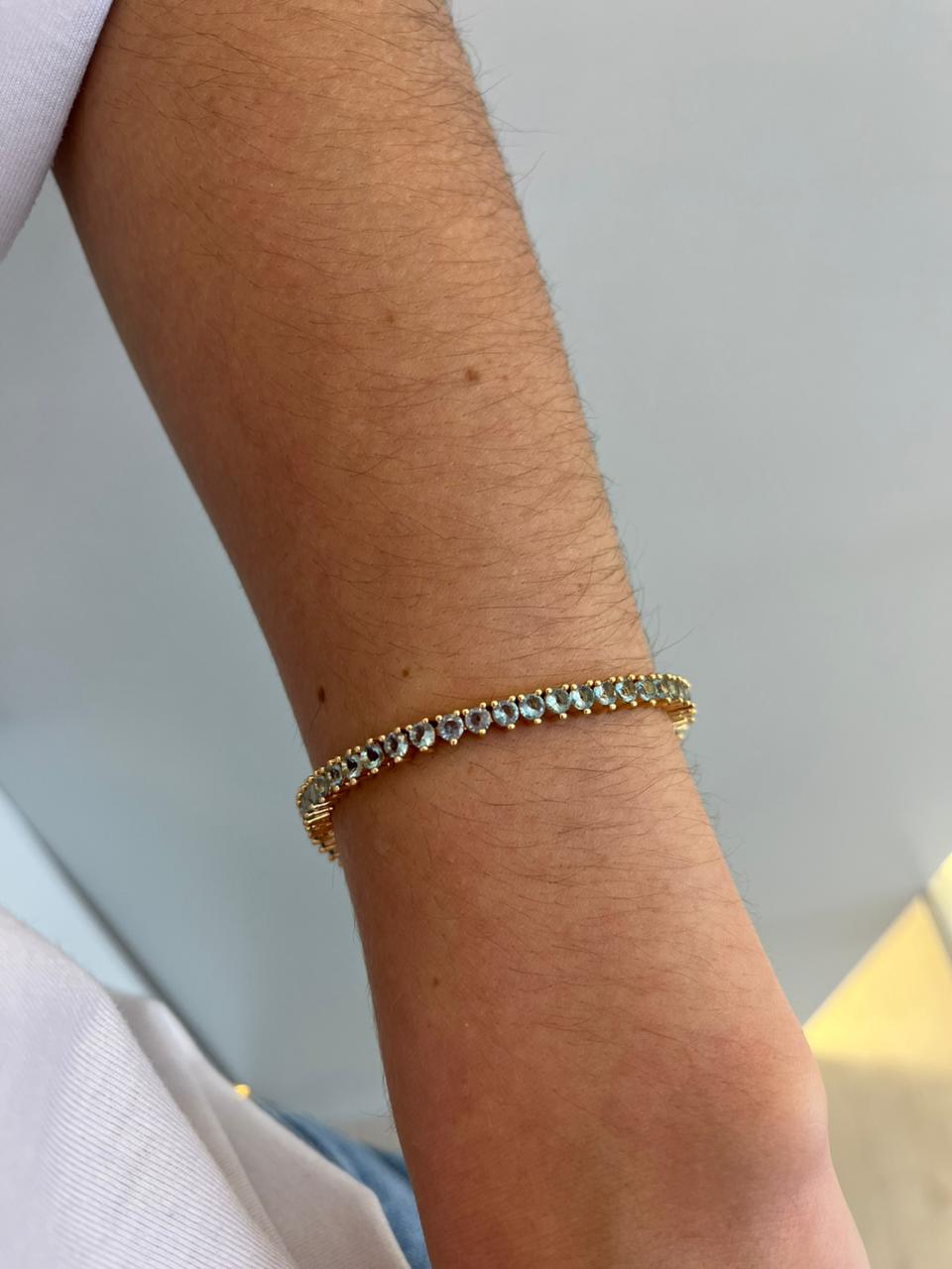 A Pulseira Riviera 3 Pontas é a combinação perfeita entre brilho, sofisticação e design moderno. Confeccionada com zircônias na cor azul delicadamente cravejadas, ela apresenta um visual refinado e luxuoso. Possui banho de ouro 18k, antialérgica e fecho caixa com travas de segurança.