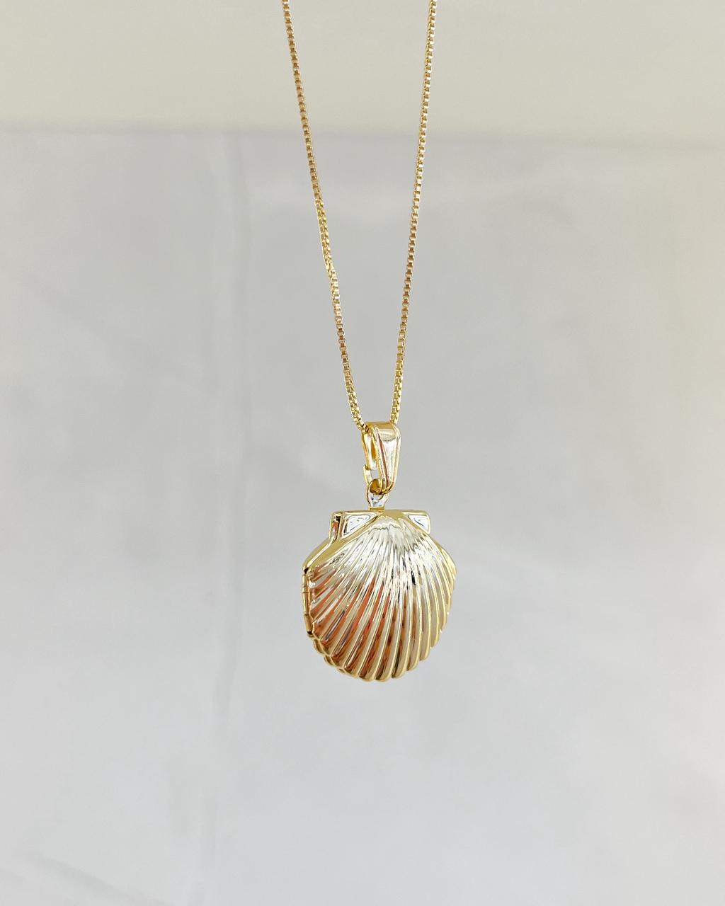 O Relicário Concha tem seu pingente em formato de concha, seu fecho no modelo lagosta e possui banho de ouro 18k.